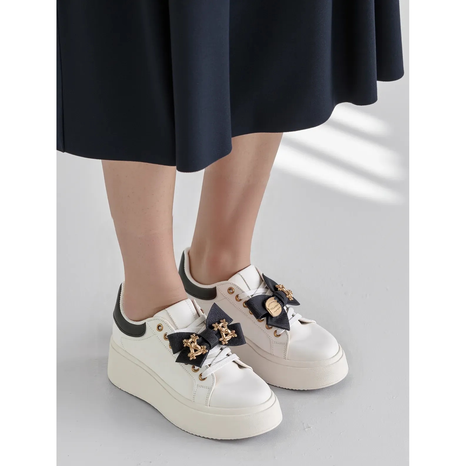 El encanto de las zapatillas de deporte de las mujeres en negro es una propuesta para mujeres que valoran la combinación de elegancia con comodidad todos los días. Estos zapatos únicos se distinguen por colores blancos y detalles decorativos, como un arco espectacular y acentos dorados sutiles que les dan originalidad. Hecho de cuero ecológico de alta calidad, proporcionan conveniencia y durabilidad durante largas horas de uso.