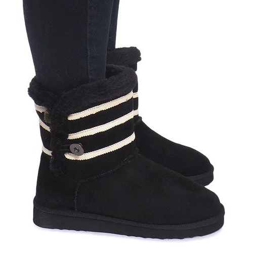 Las botas esquimales abrochadas con un botón se distinguen por un diseño moderno, complementado con rayas blancas decorativas y adornos de piel. Gracias al aislamiento, este calzado es perfecto para los días más fríos, ofreciendo calidez y comodidad de uso. Además, su característica punta redonda y su pala alta, que llega hasta media pantorrilla, las hacen no sólo prácticas, sino también elegantes.