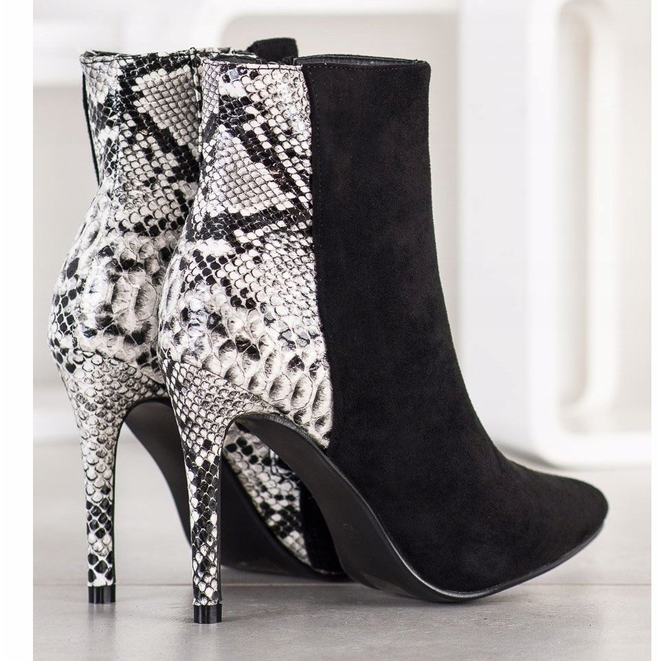 Las botas están hechas de un material duradero, es decir, cuero ecológico, que garantiza no sólo durabilidad sino también una apariencia elegante. Una interesante combinación de un frente negro con una espalda blanca y negra con un patrón de serpiente en relieve les da un carácter único, y la punta redondeada agrega elegancia.