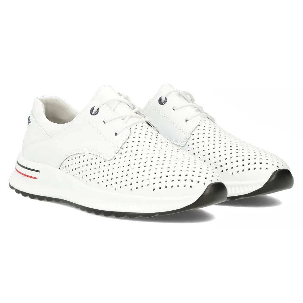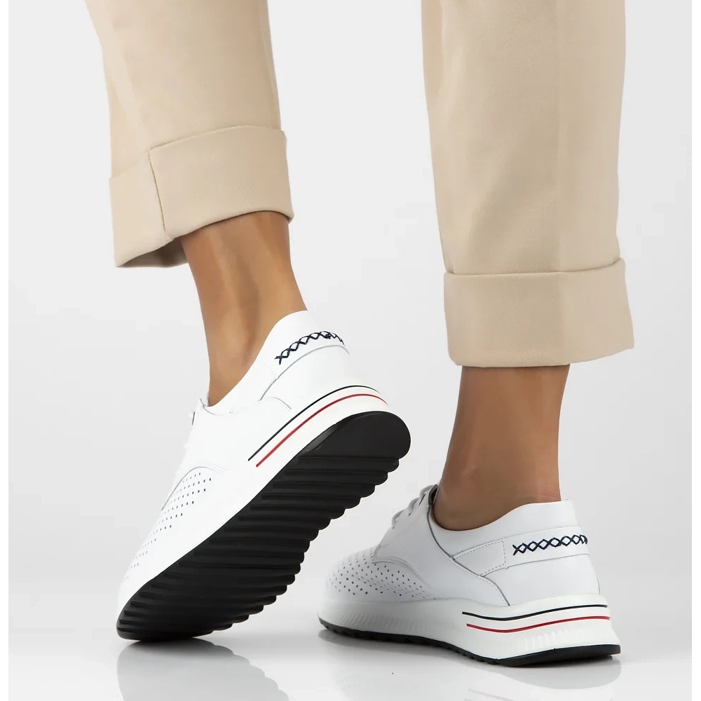 Las zapatillas deportivas y de moda son la combinación perfecta de estilo y funcionalidad. La parte superior de cuero de grano natural les da un personaje clásico y al mismo tiempo deportivo. Los detalles contrastantes les dan un aspecto único, y una suela sólida enfatiza su estética urbana. Además, gracias a la perforación, este modelo será la opción perfecta para los días de verano cuando el pie necesita descansar