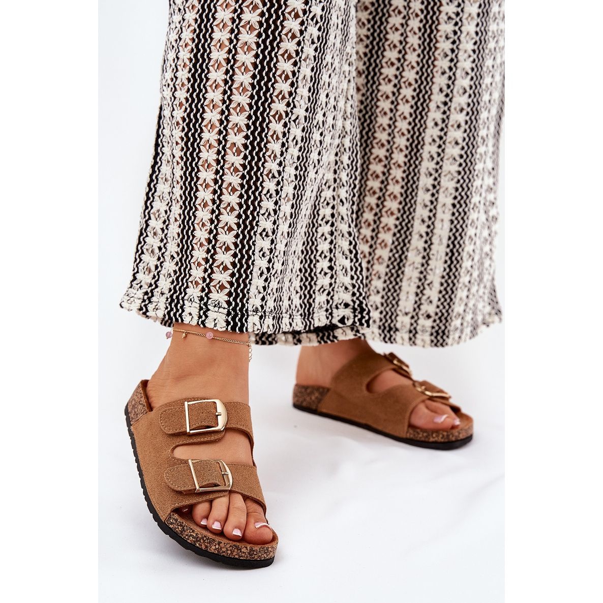 Descubra elegantes zapatillas para mujeres en una plataforma de corcho que combinan perfectamente la comodidad con el diseño de moda. En un hermoso tono marrón, estas chanclas están equipadas con dos rayas con elegantes hebillas doradas, que no solo llaman la atención, sino que también aseguran un ajuste perfecto para el pie.