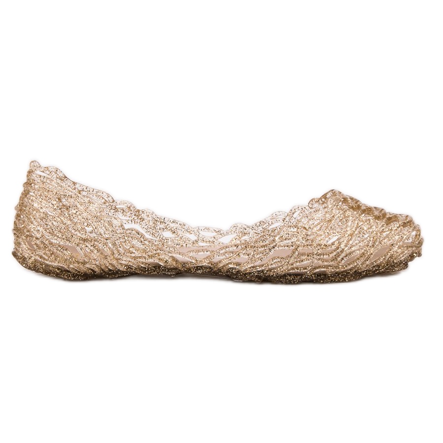 Złote Meliski Vinceza es la elección perfecta para los días de verano, combinando elegancia y comodidad. Fabricadas en goma de alta calidad, estas bailarinas se adaptan perfectamente al pie, aportando un extraordinario confort durante todo el día. La aplicación de cuero ecológico aporta sutileza, el patrón calado y el bonito color dorado llaman la atención y hacen que cada estilismo sea único.