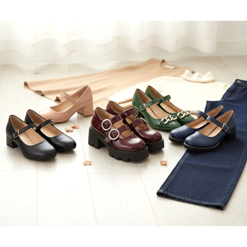 Los amantes de las tendencias pueden elegir versiones más atrevidas: Mary Jane sobre una plataforma enorme, en colores intensos o con decoraciones originales. Los modelos lacados en burdeos, verde botella o azul marino añadirán expresividad incluso a los conjuntos más sencillos.