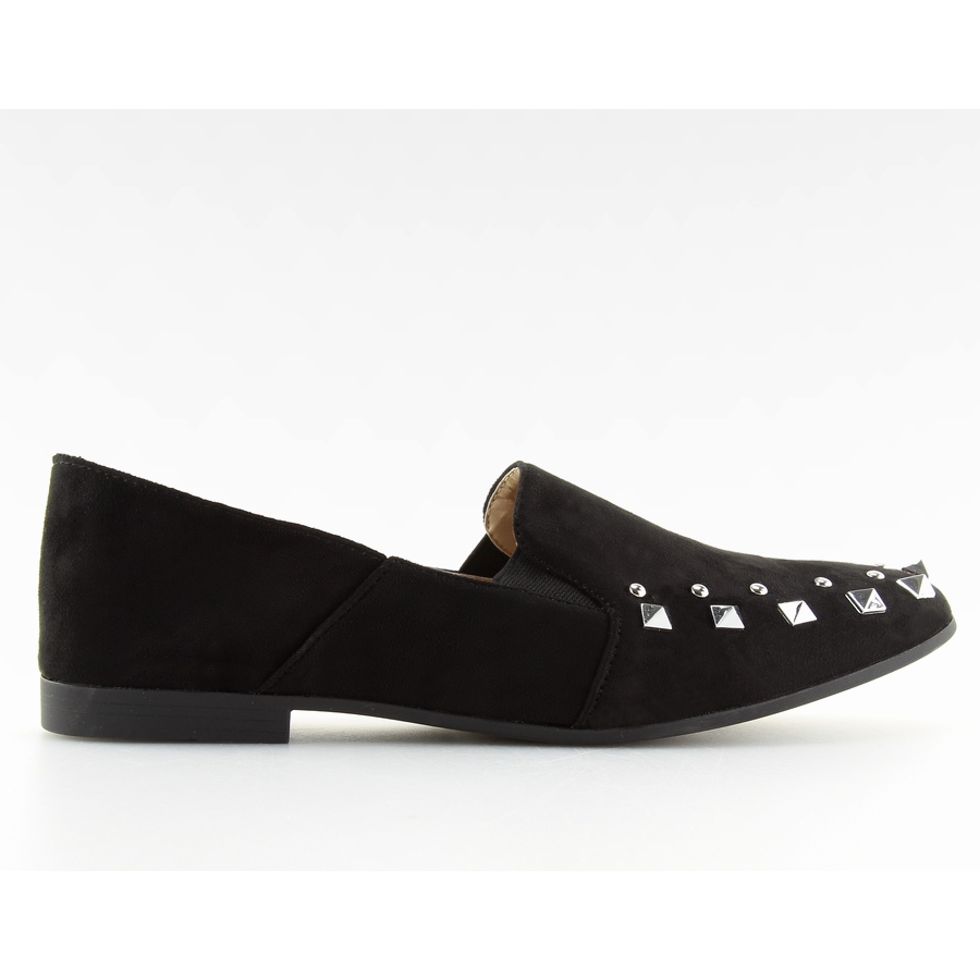 Presentamos unos mocasines señores únicos con tachuelas en un elegante color negro - modelo 1415 Black. Estos originales zapatos de mujer, fabricados en ante ecológico, son la combinación perfecta entre comodidad y estilo de moda. Las tachuelas y pedrería les dan un carácter único que sin duda llamará la atención, convirtiéndolos en una elección perfecta para diversas ocasiones.