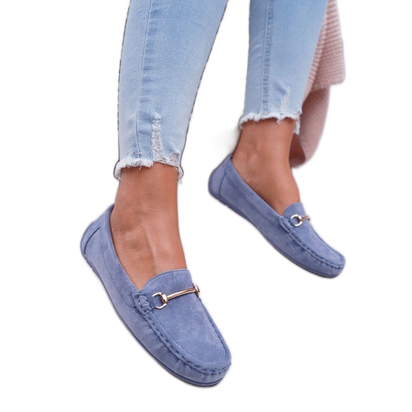 La parte superior de los mocasines está fabricada en piel ecológica ante de alta calidad, lo que garantiza suavidad y comodidad de uso. El color azul les da un aspecto fresco y elegante, y llama la atención la decoración metálica colocada en la parte delantera de la pala, dándole a los zapatos un carácter original.