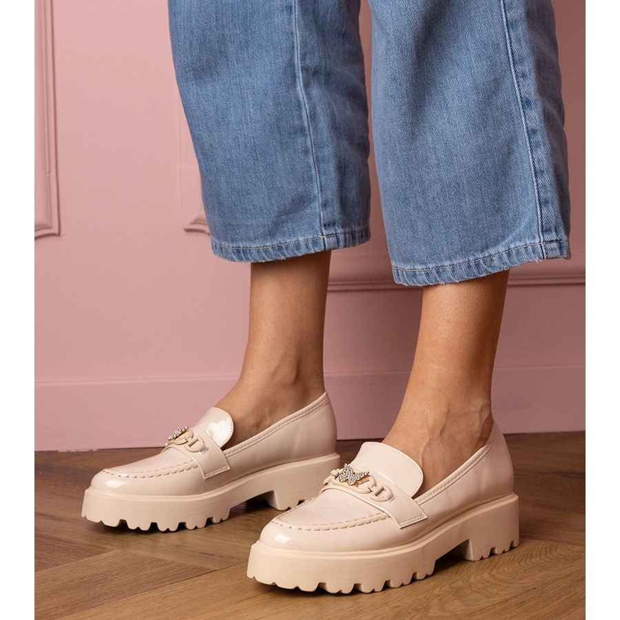 Detalles: Mocasines barnizados beige con una mariposa de circón