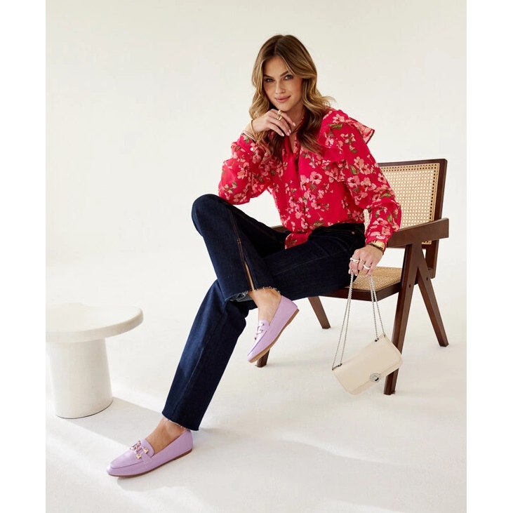 Los mocasines violetas con hebilla de Comerio se distinguen por una suela beige, que crea un contraste atractivo y agrega el carácter de toda la estilización. Además, los delicados imitaciones que decoran los zapatos brindan un poco de brillo, lo que los convierte en la elección perfecta para las salidas nocturnas.