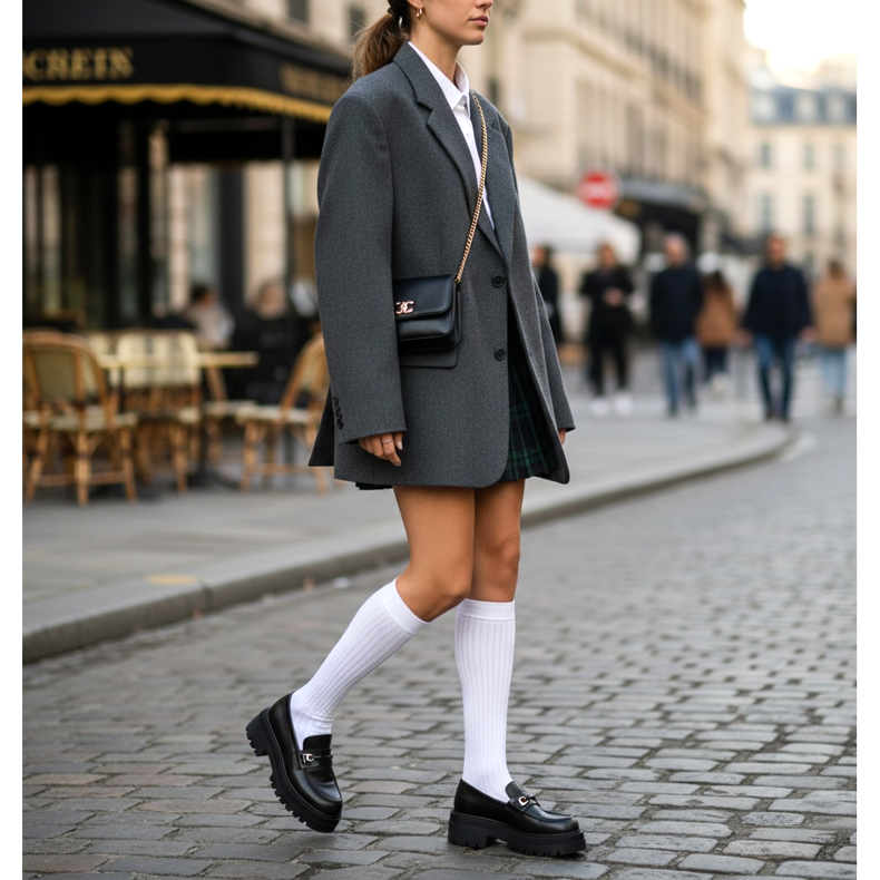 La combinación más popular y elegante son los mocasines con calcetines blancos. Este look escolar con un toque moderno está conquistando las calles de las capitales de la moda. Combínalos con una falda corta a cuadros y una chaqueta extragrande para un look preppy. Recuerde que los calcetines deben ser de un blanco impecable y sobresalir ligeramente por encima de la parte superior.