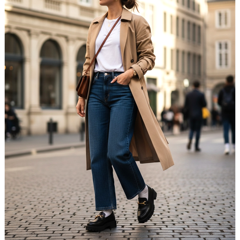 Los mocasines gruesos también quedan muy bien con unos vaqueros. Los modelos de pierna recta o ancha que caen ligeramente sobre el zapato funcionarán mejor. Evite los jeans ajustados: combinados con zapatos tan grandes, pueden alterar las proporciones de su figura. Añade una camiseta sencilla y una gabardina y tendrás el conjunto perfecto para el día a día.
