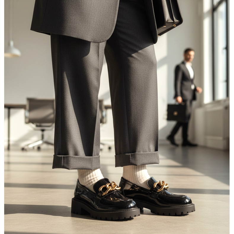 Para los amantes de la elegancia, recomendamos combinar mocasines gruesos con trajes. Elija un modelo con hebilla o cadena dorada para añadir un carácter joyero al estilo. Este conjunto es una alternativa cómoda a los tacones altos y funcionará bien en la oficina (a menos que tengas un código de vestimenta muy estricto).
