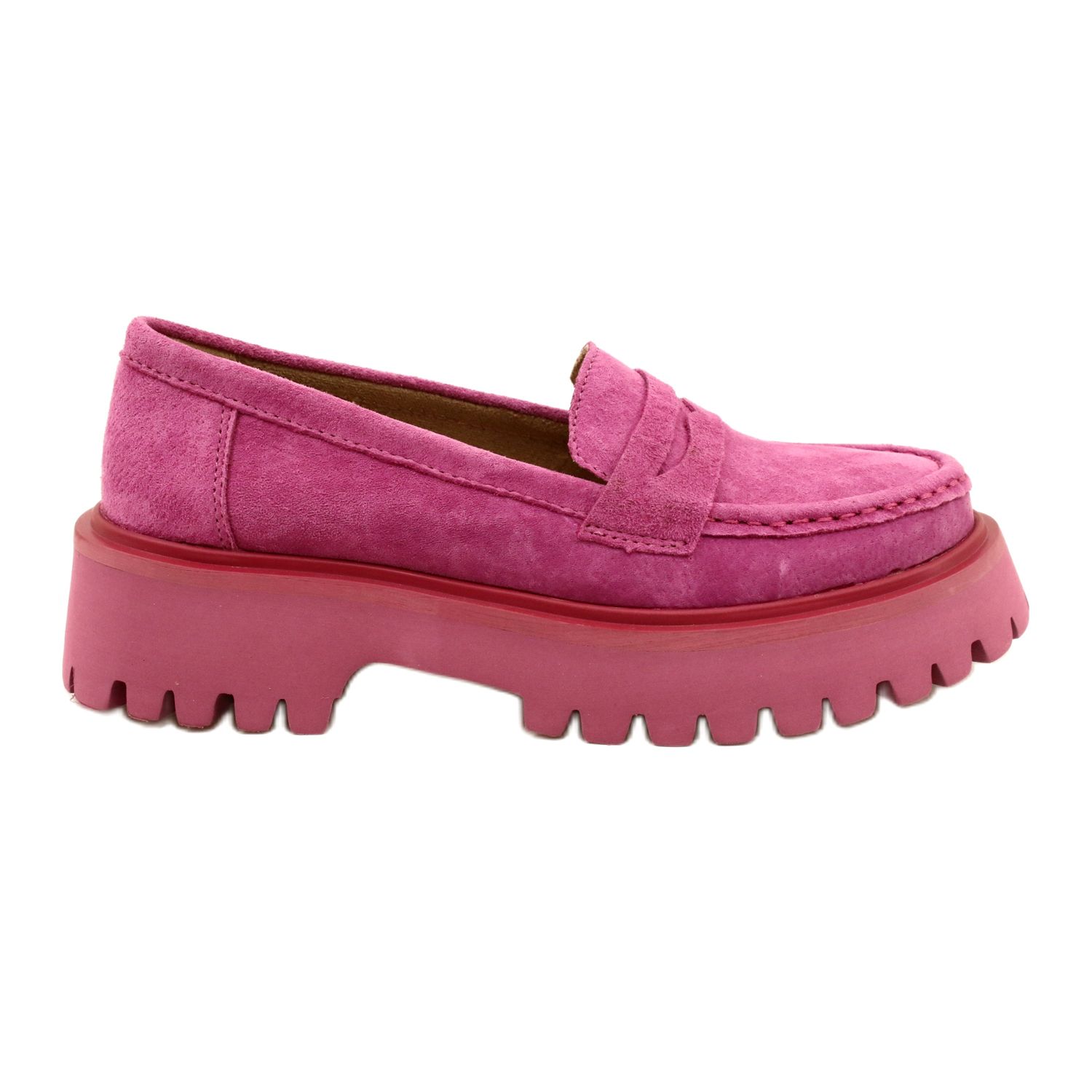 Mocasines clásicos en una edición moderna: hechos de cuero natural de gamuza de alta calidad en intenso fucsia. Una suela ligeramente elevada y un tacón de 4,5 cm de altura modelan sutilmente la silueta, agregando carácter a los zapatos, y el inserto de cuero garantiza la comodidad de usar todo el día. Perfecto para las mujeres que buscan elegancia con un toque de expresividad.