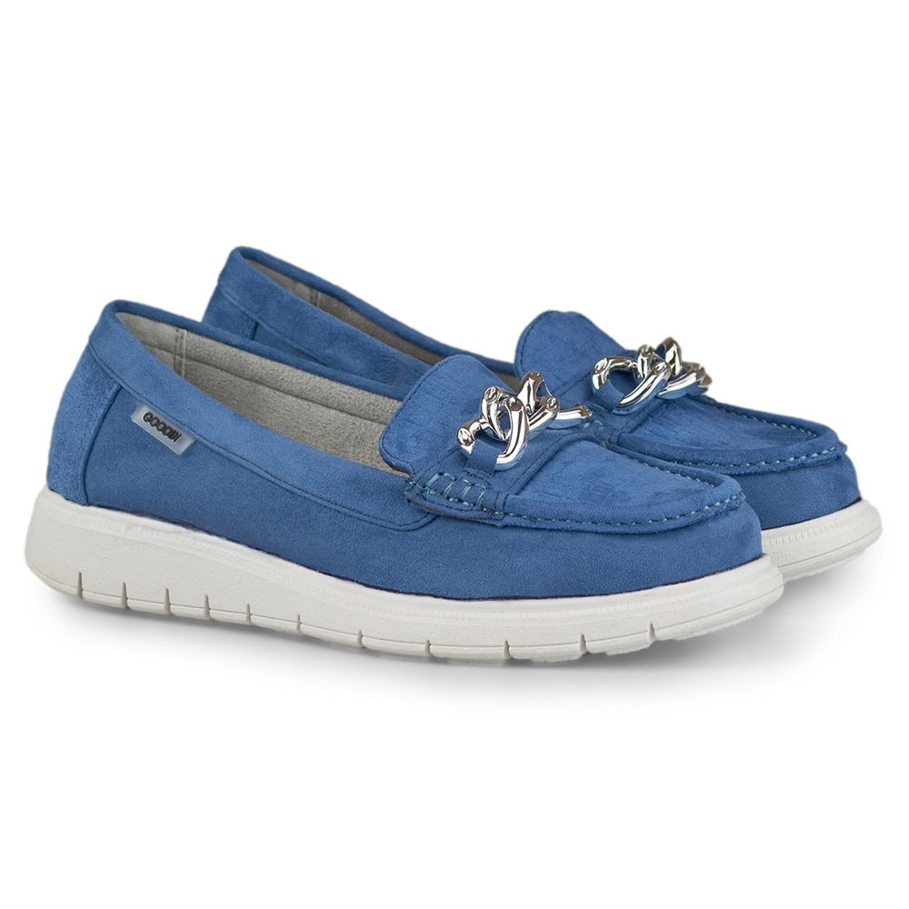 Un elemento adicional que distingue a estos mocasines es una elegante cadena, que les aporta estilo y carácter. El color azul es una opción universal que combina perfectamente con una variedad de estilos, desde el informal hasta el más elegante.