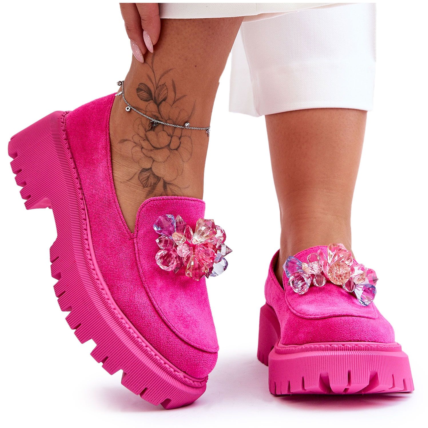 Estos mocasines están hechos de ante ecológico de alta calidad, lo que garantiza no solo una apariencia atractiva, sino también comodidad de uso. Una ventaja adicional son los cristales de colores que dan a los zapatos un brillo único y los convierten en una opción perfecta para diversas ocasiones.