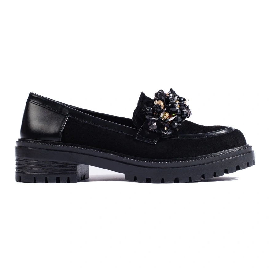 Una ventaja adicional de estos mocasines es su decoración en forma de circonitas brillantes, que aportan brillo y sofisticación a los zapatos. Montado sobre una plataforma alta, de 5 cm de altura, que enfatiza la forma de la figura y resulta cómodo incluso cuando se usa durante mucho tiempo.