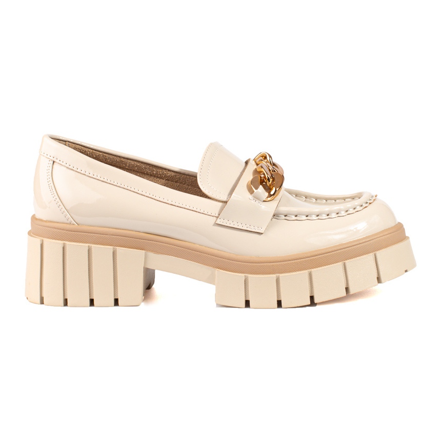 La elegante y moderna lofe Shelovet en la sombra beige es una combinación de un clásico con un acento de moda. La superficie suave y varnada de la piel orgánica le da a los zapatos un brillo lujoso, mientras que la cadena dorada enfatiza sutilmente la naturaleza del calzado, agregando estilo tanto a las estilizaciones cotidianas como más solemnes.