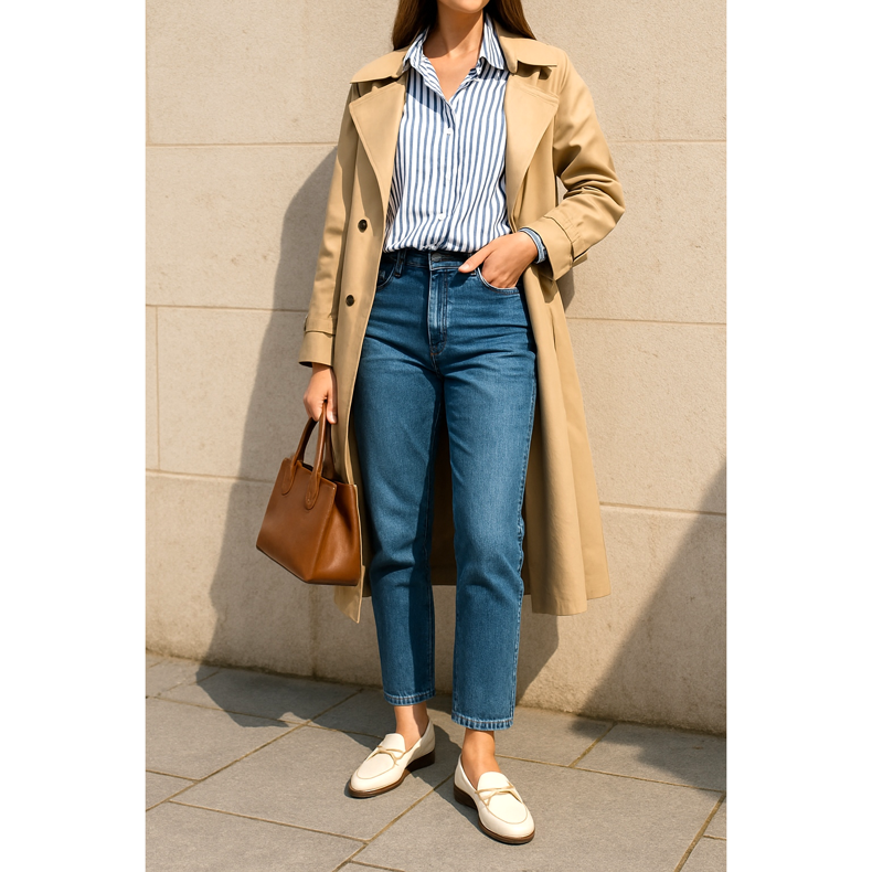 Use mocasines de cuero blanco o crema con jeans azules clásicos de corte recto. Combínalos con una camisa a rayas y una gabardina beige, creando un estilismo con el espíritu de la elegancia parisina. Este look es perfecto para pasear por la ciudad, quedar con amigos o ir de compras. Los mocasines brillantes alargarán ópticamente tus piernas y agregarán ligereza a todo el look.