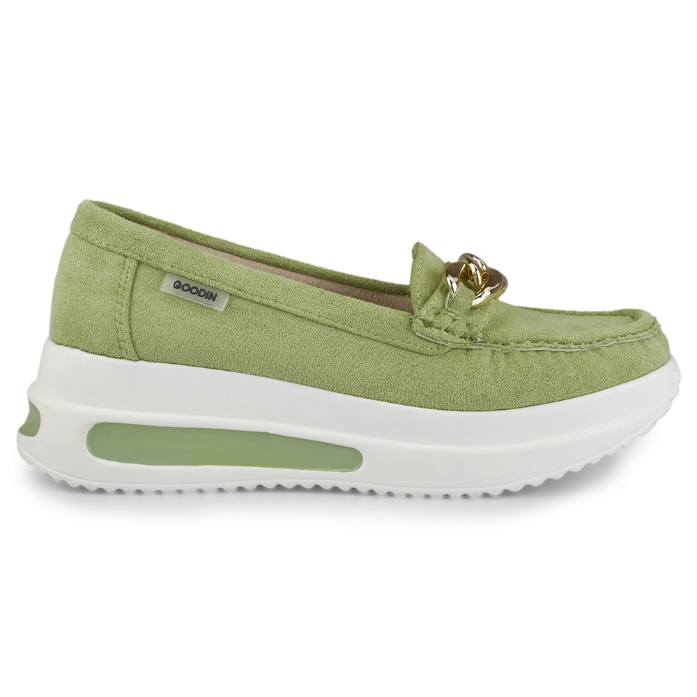 Detalles: Mocasines de mujer verde claro en la plataforma.