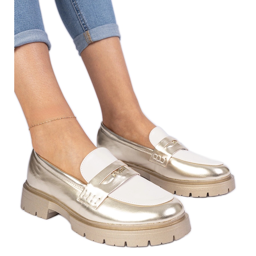 La suela hecha de plástico en color dorado enfatiza el diseño moderno de los zapatos, dándoles aún más encanto. Los mocasines dorados son una gran opción para cada mujer que quiere agregar un poco de brillo a su aspecto diario. Gracias al empaque original, estos zapatos también serán una idea de regalo ideal.