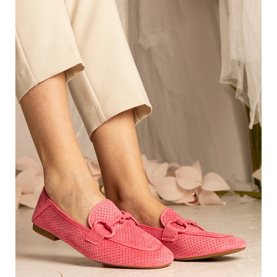 Los mocasines abiertos de las mujeres rosadas con un adorno son imprescindibles esta temporada, que combina elegancia y comodidad. Hecho de cuero de gamuza ecológico de alta calidad en un tono de fucsia de moda, estos zapatos no solo son elegantes, sino también ecológicos. El corte de trabajo abierto proporciona una excelente ventilación, gracias a la cual sus pies permanecerán frescos incluso en días calurosos.
