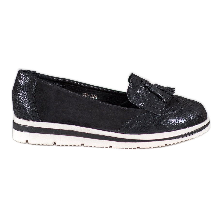 Los mocasines negros, extremadamente universales, encajan perfectamente en el estilo casual, perfecto para todos los días. Una ventaja adicional es un talón suave incorporado que garantiza un uso cómodo. Una suela de plástico con banda de rodadura garantiza estabilidad y tracción en diversas superficies.