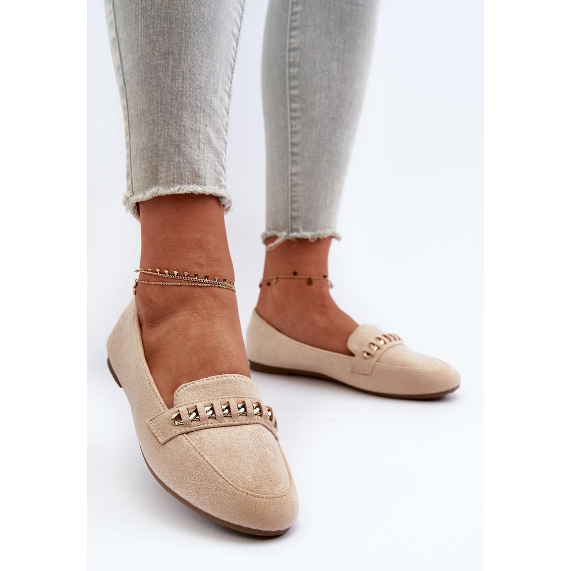 Mocasines de mujer confeccionados en ante ecológico. Adornado con hilo brillante y cinturón de cadena. Este modelo es una elección perfecta para toda mujer con estilo. La plantilla suave garantiza comodidad durante todo el día. Estos mocasines serán un complemento perfecto para tu guardarropa de verano, agregando un encanto único y elegante a cualquier atuendo.