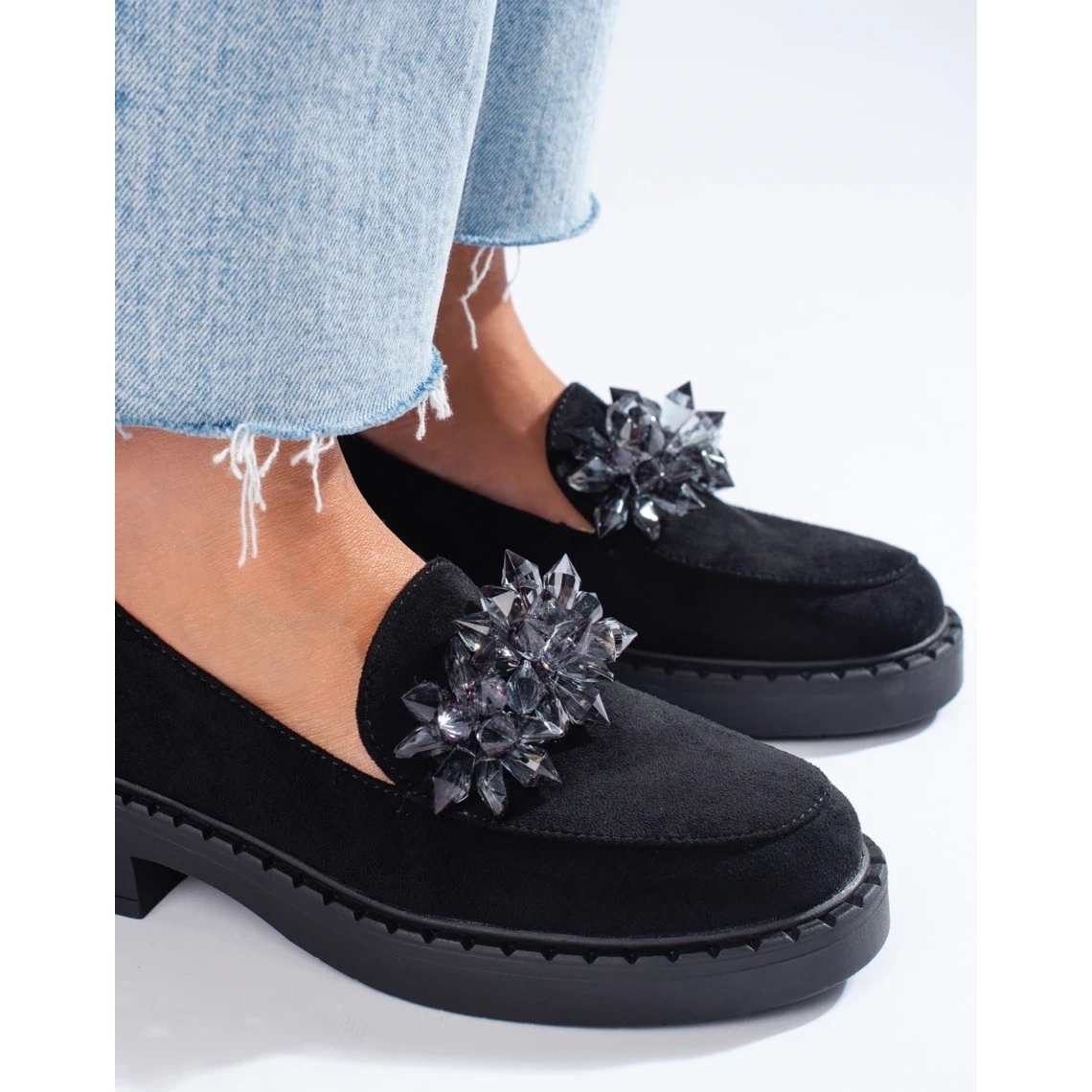 Este modelo se caracteriza por la ausencia de tacón, lo que satisface perfectamente las necesidades de las mujeres que buscan zapatos planos cómodos. Sin embargo, los pedrería adicionales son un discreto acento decorativo que añade una sutil elegancia y diversifica los mocasines clásicos.