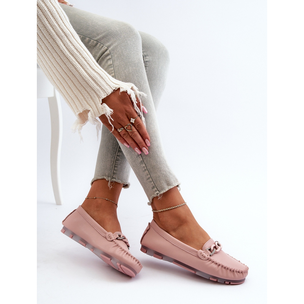 Uno de los rasgos característicos de estos mocasines es una cadena decorativa colocada en la parte delantera, que aporta un toque de carácter y originalidad a toda la estructura. El color rosa, que es el color tanto de los zapatos como de la suela, hace que estos zapatos no sólo sean elegantes, sino también de apariencia ligera. Esta es una propuesta ideal para las mujeres a las que les gusta experimentar con el estilo y no temen los acentos fuertes y modernos.