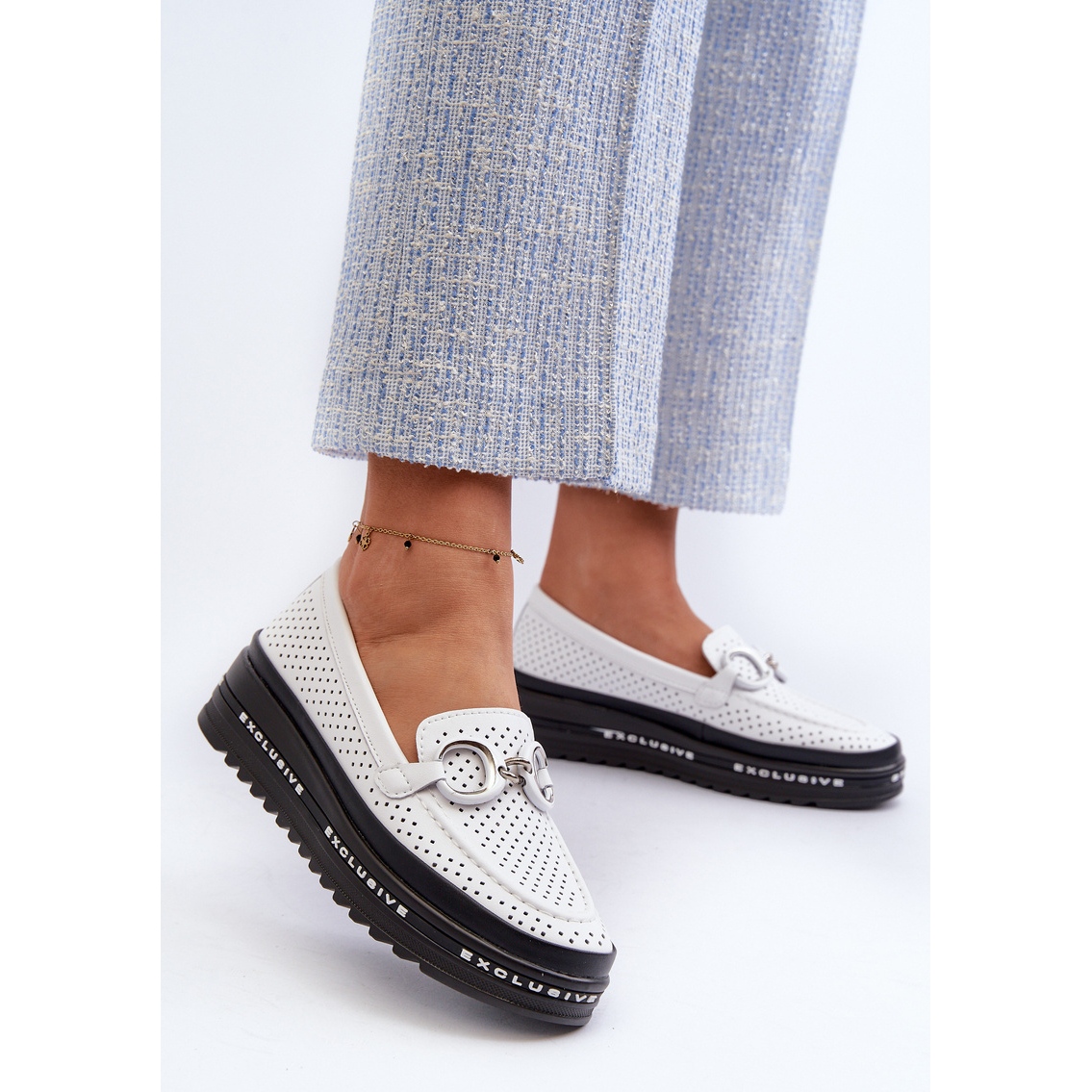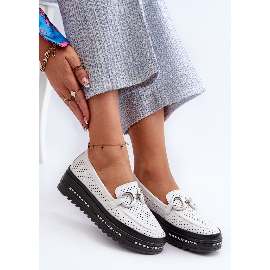 Presentamos un modelo inusual de mocasines de cuero para mujer con plataforma y decoración: S.Barski LR750. Este producto está dirigido a mujeres que valoran una combinación única de elegancia y comodidad. Hechos de cuero natural de la más alta calidad, estos mocasines blancos calados garantizan no solo una apariencia elegante, sino también durabilidad y uso a largo plazo.