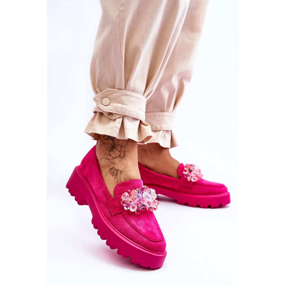 Los entusiastas de las soluciones expresivas pero al mismo tiempo cómodas en la moda urbana estarán encantados con la última propuesta del fabricante FB2: mocasines de mujer con plataforma y adornos fucsia Brenda. Estos encantadores zapatos en un tono de rosa enérgico son la esencia del estilo y la comodidad, perfectos para muchos estilos de primavera y otoño.
