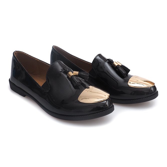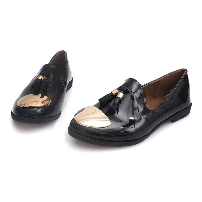 Una placa dorada decorativa sobre la punta redondeada y flecos hechos de material negro añaden carácter y estilo moderno a los mocasines. Los delicados refuerzos de goma en los laterales facilitan su colocación, lo que los convierte en una opción aún más práctica para el uso diario.