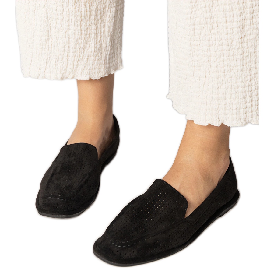 Los mocasines hechos de cuero ecológico de gamuza no solo aseguran la durabilidad, sino también la apariencia estética. El patrón de trabajo abierto les da ligereza, lo que los convierte en una excelente opción para los días de primavera y verano. Estos mocasines negros y deslizados se mezclan bien con estilizaciones cotidianas y más elegantes, lo que los convierte en un elemento versátil de ropa.