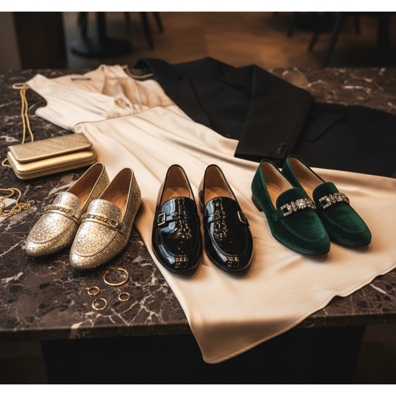 Para una salida nocturna, elige mocasines con un acabado brillante. Combínalos con un traje elegante o un vestido midi de raso. Añada joyas de oro y un bolso de noche con cadena: el efecto WOW está garantizado.