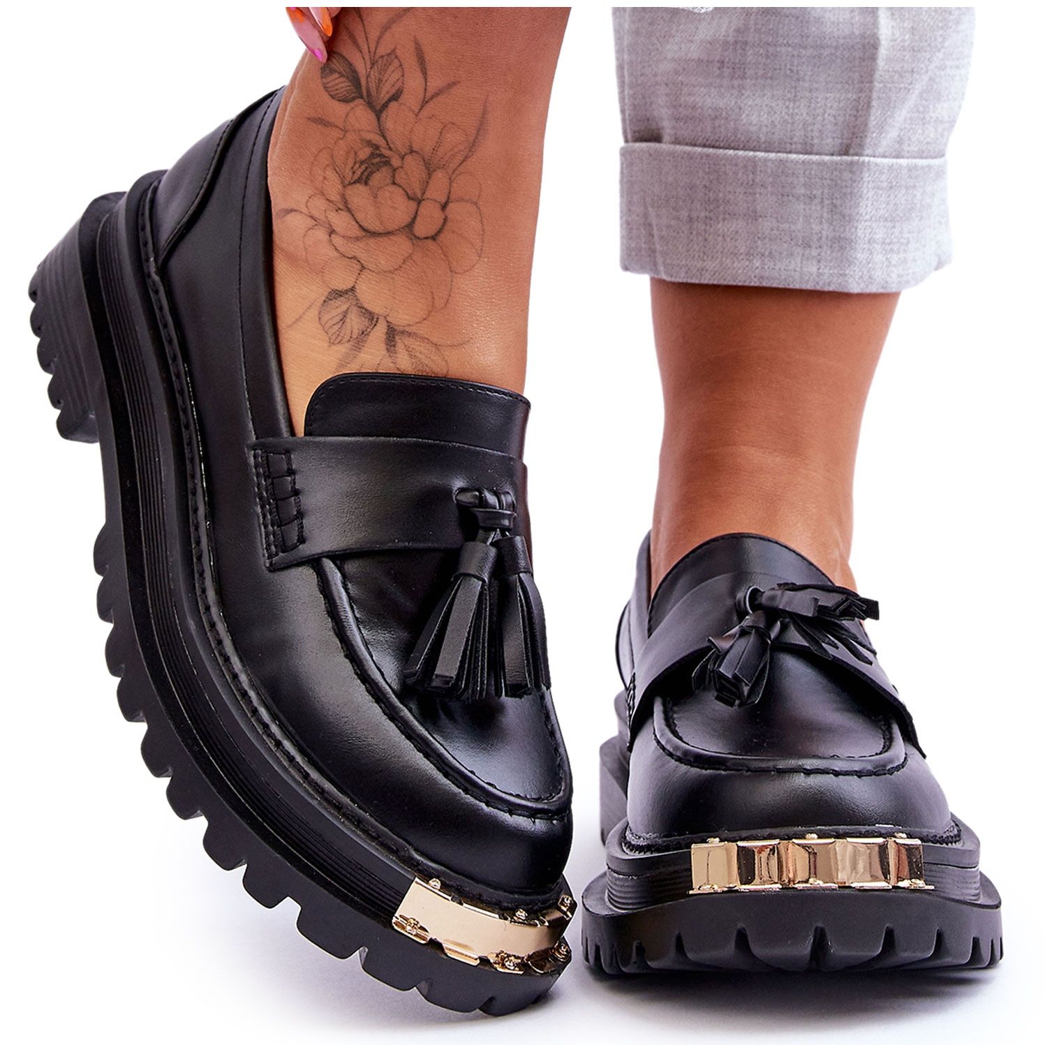 Elegantes mocasines negros hechos de cuero ecológico son una propuesta que combina la comodidad con un detalle de moda. En el frente hay una decoración sutil y dorada, y en el medio de las franjas elegantes superiores que agregan carácter y ligereza. El modelo está ubicado en una plataforma estable de 4.5 cm de altura con un talón plano, lo que garantiza la comodidad de usar todo el día.