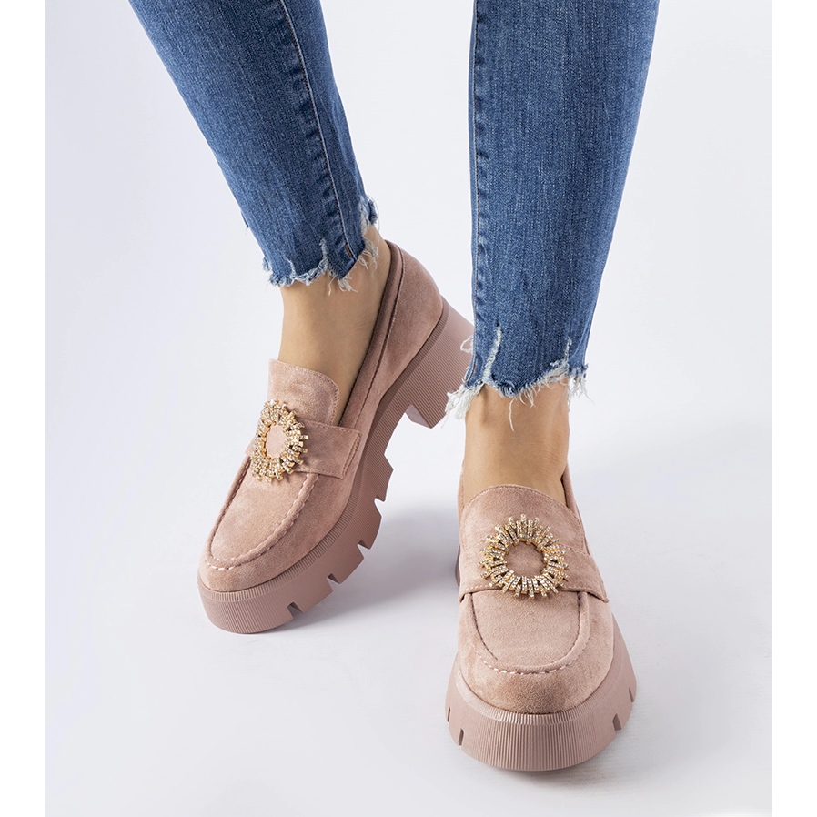 Mocasines elegantes y femeninos en un tono rosado: una combinación perfecta de clásicos y un brillo sutil. El modelo G1709 se distingue por una nariz redonda y una hebilla decorativa con circones, lo que agrega el estilo de estilo a diario y para ocasiones más formales. Los zapatos bajos e insertados en un cómodo tacones de 5 cm aseguran la estabilidad y la comodidad durante todo el día.