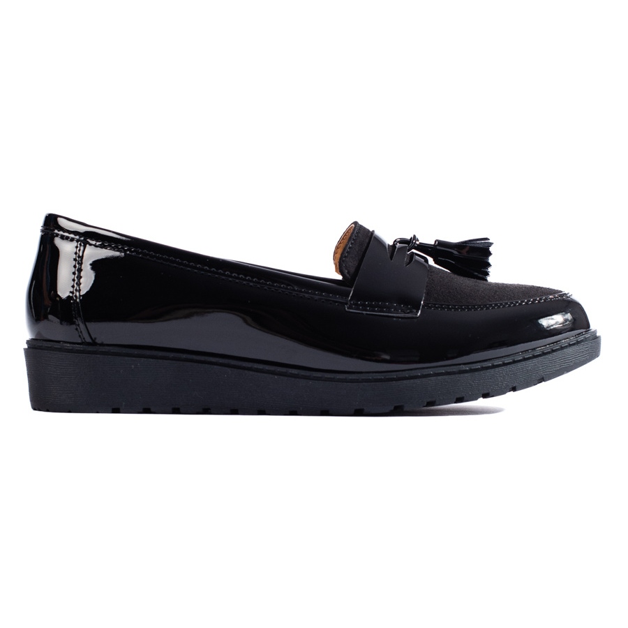 Los mocasines cuentan con una plataforma de 4 cm de altura, lo que suma comodidad y confianza en cada paso. Su capa exterior está hecha de charol ecológico, que no sólo tiene un aspecto elegante, sino que también los hace duraderos y fáciles de cuidar. La punta redonda y los flecos en la parte delantera le dan a los zapatos un carácter único, y el clásico color negro los hace fáciles de combinar con una variedad de estilos.