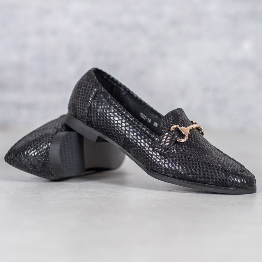 Los mocasines VICES con estampado de serpiente en negro son la elección perfecta para las mujeres que valoran tanto un look moderno como la comodidad de uso. Fabricados con un material similar a la piel de alta calidad, estos elegantes zapatos se distinguen por un original motivo que imita la piel de serpiente, lo que les confiere un carácter único.
