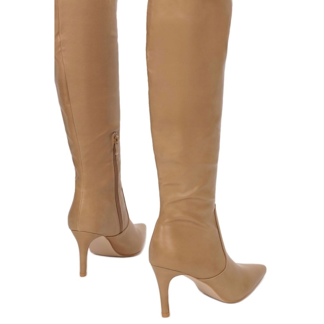 Las botas tienen la punta en punta, lo que aporta estilo y alarga ópticamente las piernas. La caña alta que llega hasta la rodilla y el tacón de 7 cm no sólo realzan la figura, sino que también proporcionan una estabilidad excepcional. El aislamiento hace que este modelo sea perfecto para los días más fríos, y la cremallera lateral facilita su calce, lo que los hace aún más prácticos.