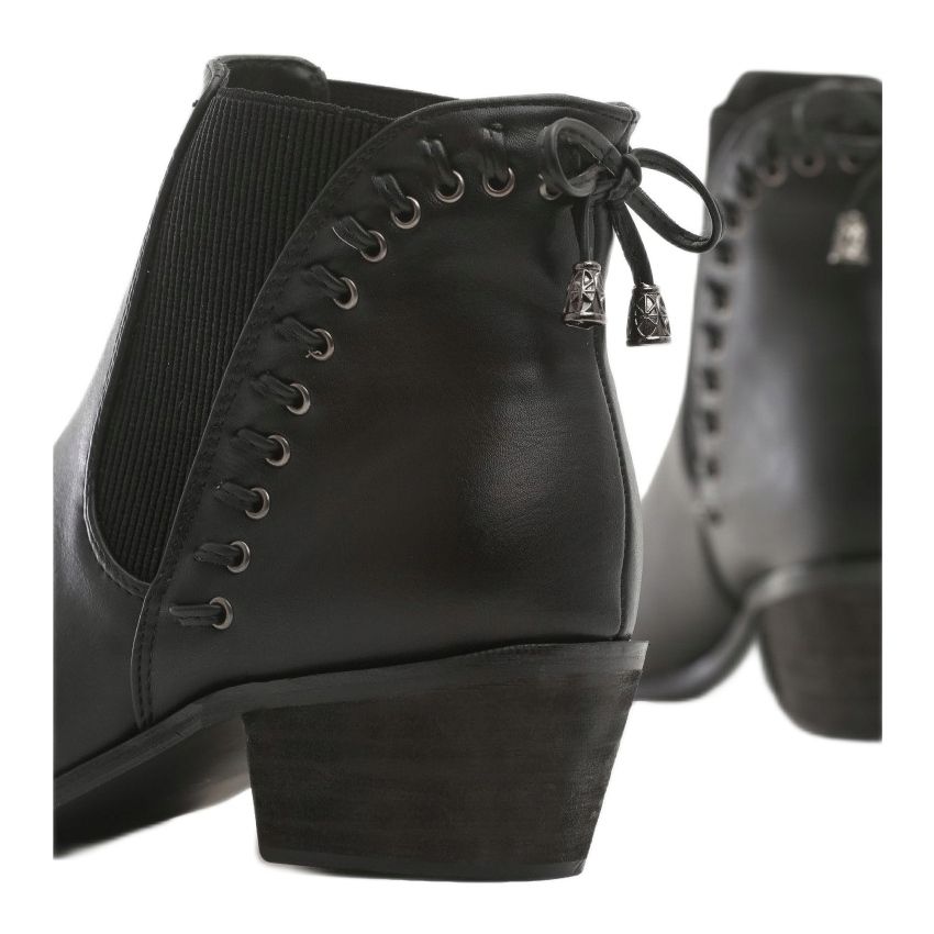 Los botines Vices se caracterizan por un tacón plano con una altura de 4,5 cm, lo que garantiza estabilidad y comodidad al usarlos. Elementos adicionales, como la pedrería, les dan un carácter original y ligeramente rockero. Con puntera almendrada, estas botas añaden elegancia y hacen que cada pie luzca único.