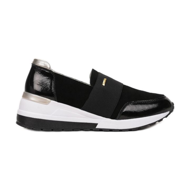 Te presentamos las zapatillas Vices FT87-184 en versión negra y dorada, que combinan a la perfección el estilo moderno con la comodidad del uso diario. Estos zapatos únicos con cuña baja se distinguen por una suela más gruesa con banda de rodadura, que garantiza no solo estabilidad, sino también un aspecto moderno. Gracias al corte sin cordones con caña en el tobillo y puntera redonda, estas zapatillas no sólo son cómodas, sino también fáciles de poner y quitar.