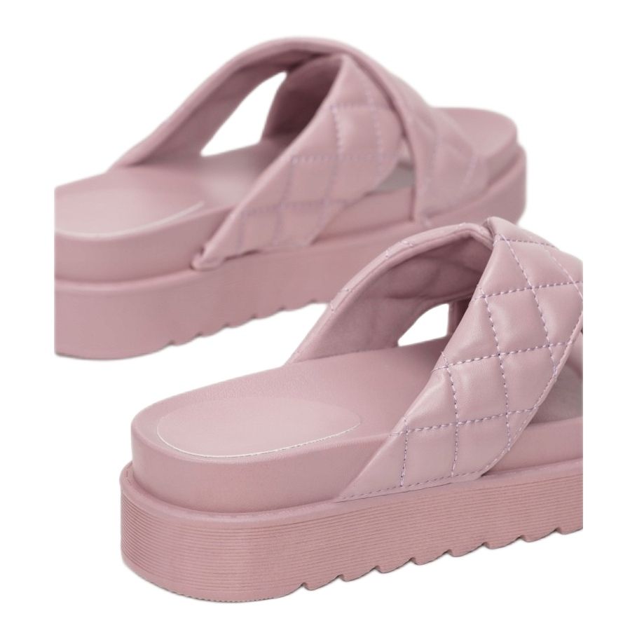 Confeccionadas en ecopiel de alta calidad, las chanclas cuentan con tiras cruzadas que aportan estilo gracias al patrón acolchado en forma de rombos. La puntera y el talón abiertos, así como la punta redonda, los convierten en una opción ideal para los días cálidos. Además, una suela de material sintético de 4,5 cm de altura y un inserto de goma proporcionan una amortiguación y sujeción adecuadas para los pies.