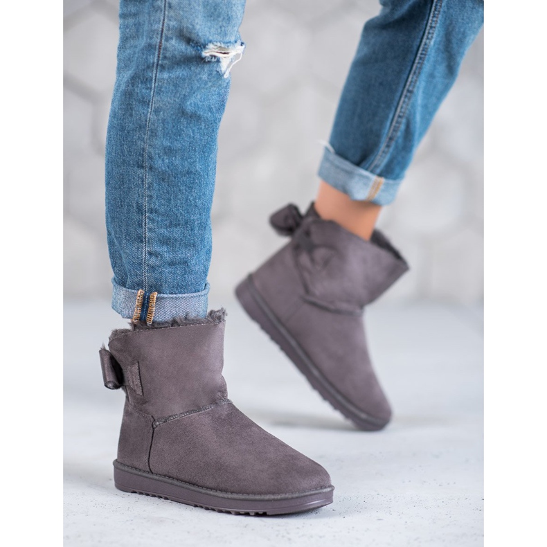 Los mukluks grises con lazo son la elección perfecta para la próxima temporada otoño-invierno para toda mujer que valora la combinación de comodidad y estilo. Confeccionados en ante ecológico, estos zapatos no sólo tienen un aspecto extremadamente elegante, sino que también envuelven agradablemente tus pies y los mantienen calientes gracias al aislamiento de pelo del interior.