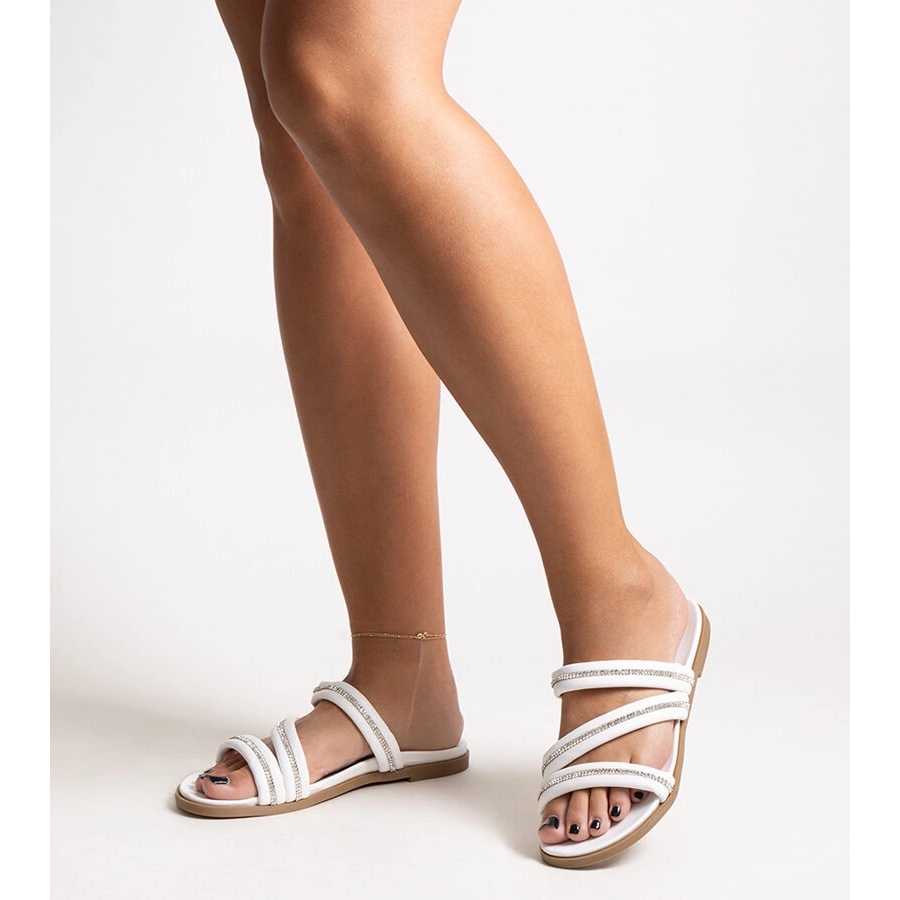 Estas chanclas planas, diseñadas para uso diario, se caracterizan por un cierre deslizante, lo que hace que sea más fácil ponerse y eliminar. El dedo redondo y las delicadas decoraciones en forma de circón les dan un personaje único y les hacen que los ojos sean con los ojos. Gracias al tacón bajo, de 1 cm de altura, las aletas aseguran la estabilidad y la comodidad, lo que los convierte en la elección perfecta para largos días de verano.