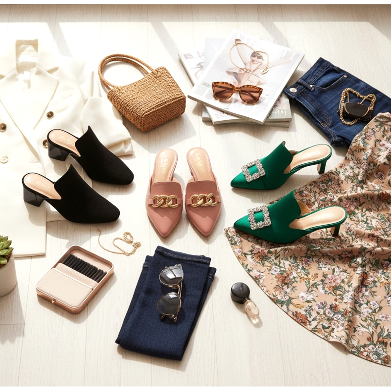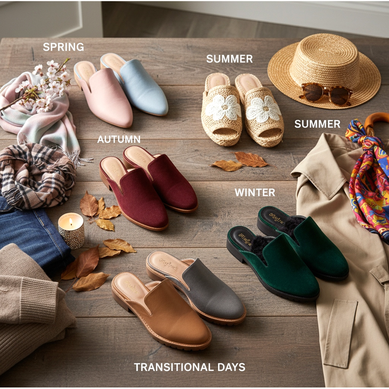 Días de transición – en caso de tiempo incierto, elija mules con una suela más gruesa y una parte delantera más formada. Evite materiales delicados sensibles a la humedad.