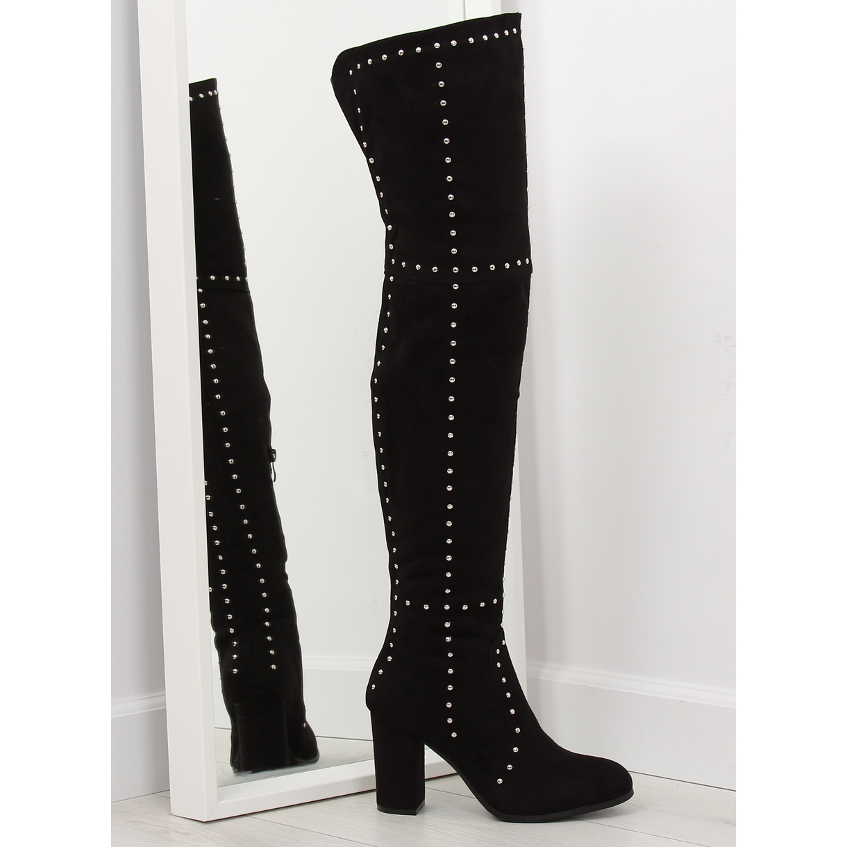 Muslo tacones altos El diseño simple y clásico es la garantía de un estilo atemporal que nunca pasará de moda, y los tacos llamativos que crean un patrón único les dan un carácter original. Las botas tienen un talón estable, un palo de 9 cm de alto que garantizará la comodidad al caminar. Cremallera lateral para facilitar la colocación. Están confeccionados en gamuza ecológica sobre una base de espuma.