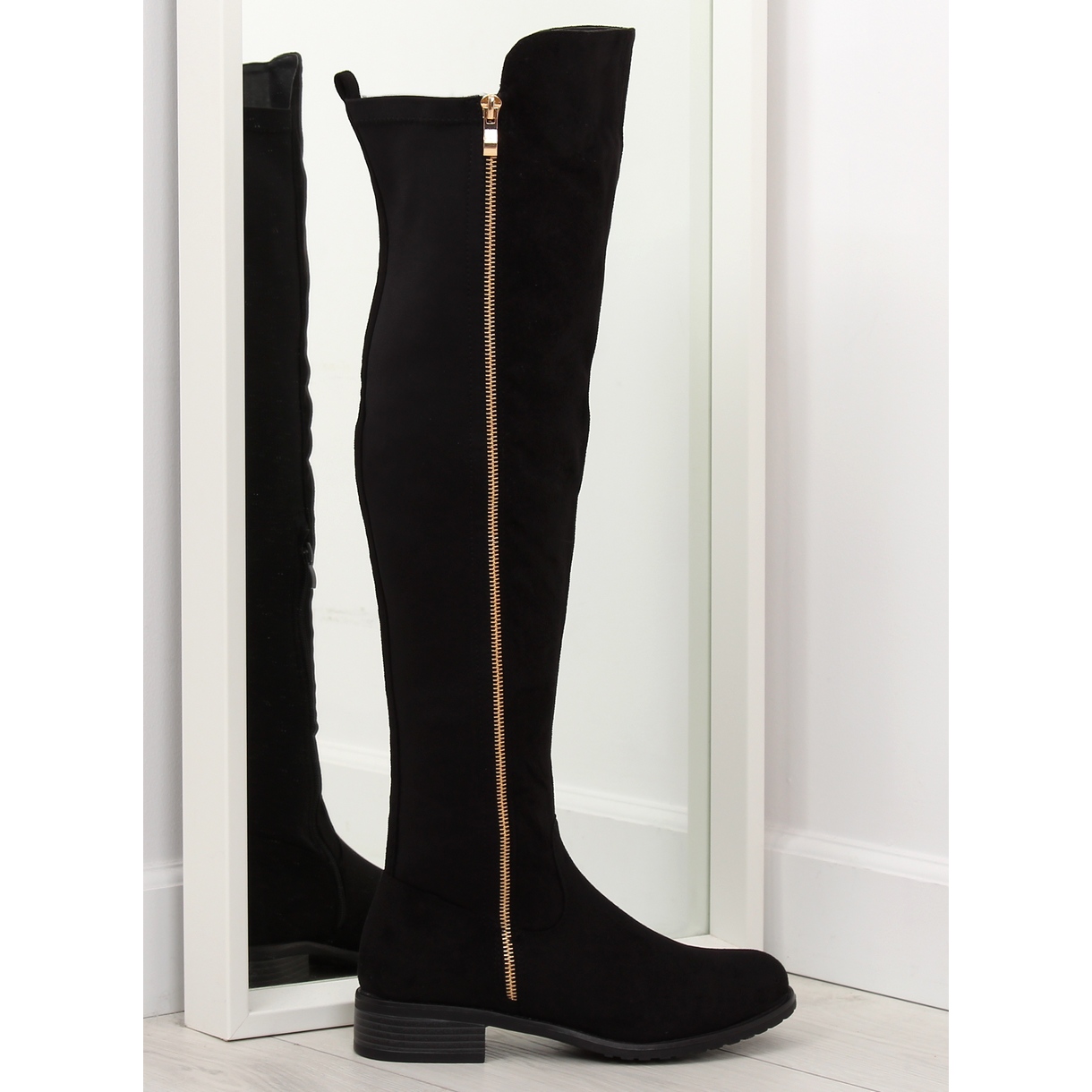Muslos de mujer con tacones planos. Su corte clásico se ha roto con un deslizador dorado decorativo que enfatiza su estilo único. Un acento interesante y cómodo es también un inserto flexible en la parte posterior de la parte superior, gracias a la cual los zapatos se ajustan perfectamente a la pantorrilla. Una cremallera lateral práctica es otro argumento para estos mosqueteros. Están hechas de gamuza ecológica, y el interior está forrado con un pelaje delicado.