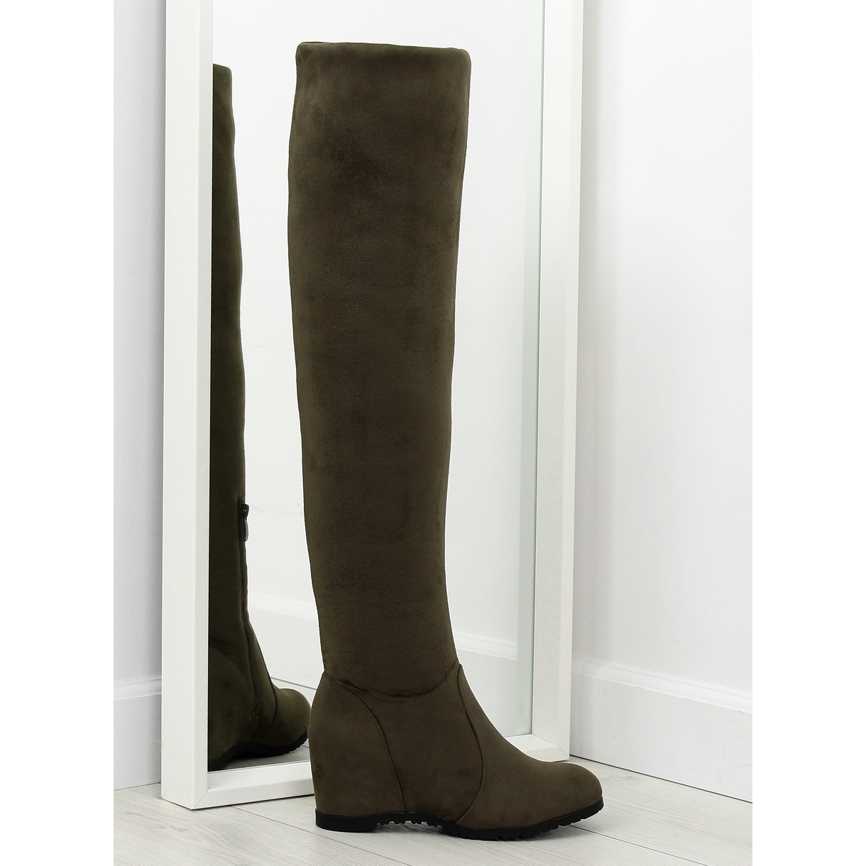 Muslos de mujeres en alturas de cuña de 7 cm de altura. Te encantarán por su moda sencilla y clásica en una edición elegante. La cremallera en el lateral de la parte superior facilita su colocación. ¡Estos zapatos son la garantía de un estilo atemporal que nunca pasará de moda! Están hechas de una gamuza ecológica muy agradable al tacto, y el interior está forrado con un pelaje delicado.