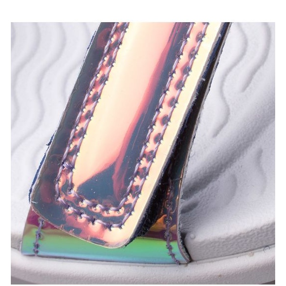 La estética de las sandalias se enfatiza con una parte superior plateada con un efecto holográfico que cambia de color en diferentes ángulos. La plantilla y la suela son blancas, mientras que la parte superior es azul marino por dentro.