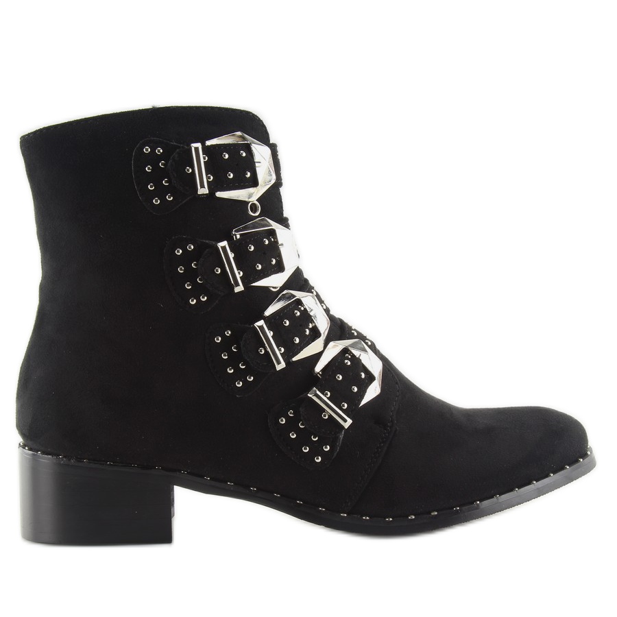 Te presentamos unos botines únicos con tachuelas 9276 en color negro, perfectos para toda mujer fashionista que quiera añadir un toque de estilo rockero a su armario. Estos botines de ante para mujer se distinguen por sus tachuelas plateadas sutilmente colocadas y sus correas con hebillas brillantes que llaman la atención y aportan carácter.