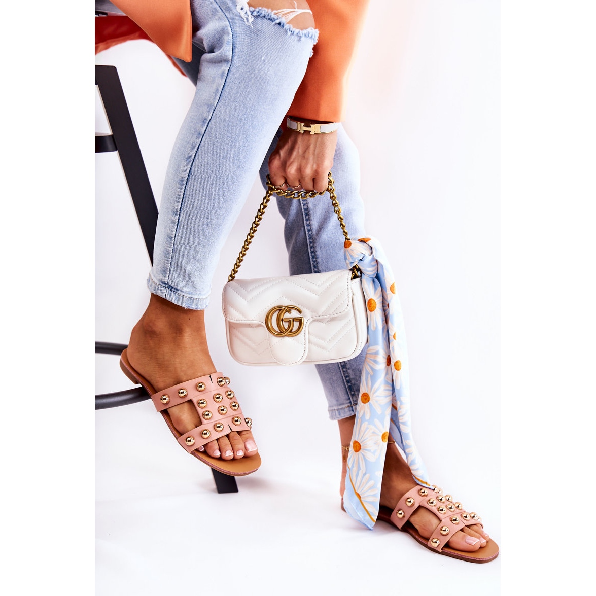 ¡Conoce las clásicas chanclas de mujer PG1, que serán una elección perfecta para los días calurosos! Fabricadas en ecopiel de alta calidad, estas chanclas rosas se distinguen por delicados cortes en las correas y hermosas decoraciones de espejos en forma de hemisferios, que aportan elegancia y estilo.
