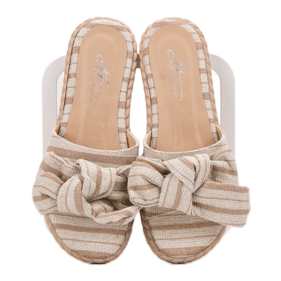 El estampado de rayas en el cinturón y el forro les da originalidad, y el encantador lazo colocado en el medio enfatiza su singularidad. Las chanclas están equipadas con una plantilla suave de cuero ecológico, que garantiza comodidad durante todo el día.